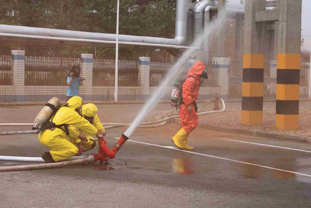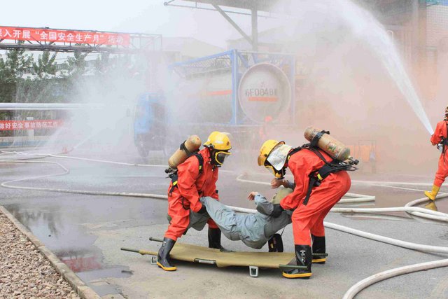 6月21日上午,9時40分,江山股份氯氣站一輛裝有20噸液氯的槽罐車在接卸液氯作業(yè)時,管道“發(fā)生”氯氣泄漏,氯氣向周邊擴(kuò)散,影響了附近企業(yè)和居民的人身安全……這是南通市氯氣泄漏事故應(yīng)急綜合演練中的一幕。 由市政府主辦、江山股份承辦的南通市氯氣泄漏事故應(yīng)急綜合演練是2012年南通市安全生產(chǎn)月的“重頭戲”, 此次應(yīng)急演練重在提高政府、職能部門、企業(yè)應(yīng)對危險化學(xué)品事故的應(yīng)急處置能力,最大限度減少因安全生產(chǎn)事故給企業(yè)和人民群眾造成的財產(chǎn)損失和人員傷亡。 由于氯氣是具有刺激性氣味的有毒氣體,可以溶解于水,因此應(yīng)急處理主要是通過噴灑形成水霧的方法來降低氯氣濃度,控制擴(kuò)散范圍。現(xiàn)場用紅色煙霧代替黃綠色氯氣。演練中,市安監(jiān)、公安、消防、環(huán)保、質(zhì)監(jiān)、衛(wèi)生、氣象等部門積極聯(lián)動,各司其職,氣象部門提供風(fēng)力、溫度、濕度等實時數(shù)據(jù),環(huán)保部門負(fù)責(zé)空氣中氯氣含量檢測,公安負(fù)責(zé)交通管制和疏散救援……僅用了不到40分鐘即圓滿完成了泄漏源堵漏和周邊企業(yè)及居民的疏散工作,充分展示并檢驗了市政府、職能部門及企業(yè)應(yīng)對危險化學(xué)品事故的應(yīng)急處置能力。 副市長徐輝擔(dān)任現(xiàn)場總指揮,并對演練做了綜合點評。江山股份董事長李大軍觀摩現(xiàn)場演練,總經(jīng)理薛健任現(xiàn)場副指揮。
