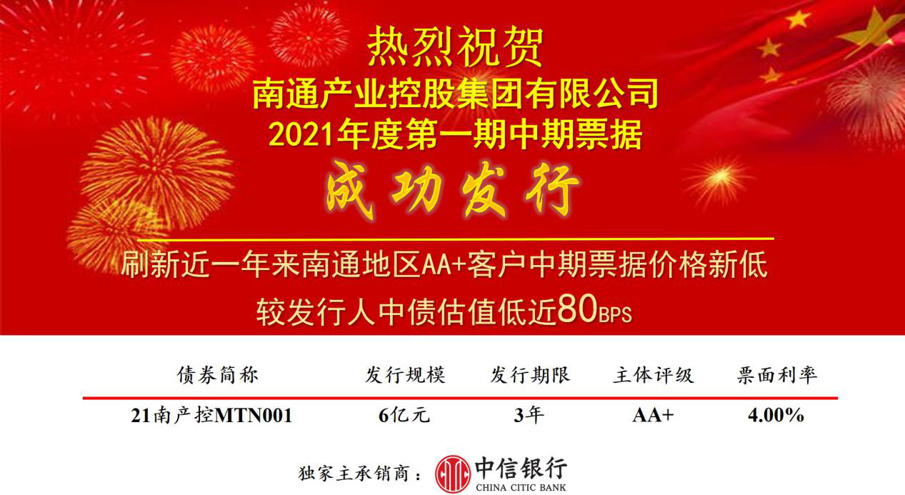 2021年4月22日,產(chǎn)控集團(tuán)成功發(fā)行6億元中期票據(jù)。由于產(chǎn)控集團(tuán)的良好資質(zhì)得到投資者的認(rèn)可,本期中票簿記倍數(shù)1.6倍,邊際倍數(shù)1.16倍,票面利率4%,比集團(tuán)三年期債券估值低近80BPS,同時(shí)創(chuàng)下了近一年來(lái)南通地區(qū)AA+評(píng)級(jí)中期票據(jù)價(jià)格新低。
