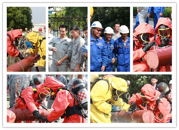 穿戴空呼器帶壓堵漏,需要檢驗參賽隊員規范穿戴空呼器、防化服的速度和熟練程度,同時還要考驗參賽隊員穿戴好空呼器、防化服進行高效、快速帶壓堵漏的應急處置技能。