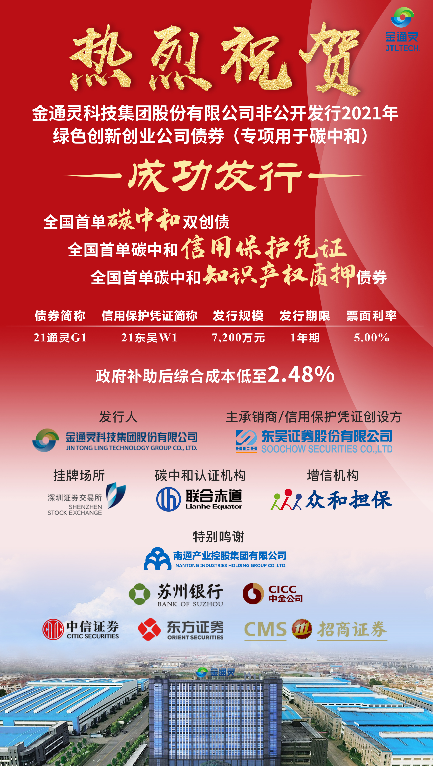 8月18日,南通產(chǎn)業(yè)控股集團(tuán)控股的上市公司金通靈科技集團(tuán)股份有限公司(SZ.300091,金通靈)非公開發(fā)行2021年綠色創(chuàng)新創(chuàng)業(yè)公司債券(專項用于碳中和)成功發(fā)行。債券簡稱“21通靈G1”,債券代碼“133055”,發(fā)行規(guī)模7200萬元,綜合融資成本年化僅為2.48% 。實(shí)現(xiàn)了3個全國首單,即全國首單碳中和知識產(chǎn)權(quán)質(zhì)押債券,全國首單使用知識產(chǎn)權(quán)為債券提供質(zhì)押擔(dān)保且募集資金用于碳中和領(lǐng)域的債券;全國首單碳中和雙創(chuàng)債券,全國首單創(chuàng)新創(chuàng)業(yè)公司發(fā)行的募集資金用于碳中和領(lǐng)域的債券;全國首單碳中和信用保護(hù)憑證,在南通眾和擔(dān)保提供全額擔(dān)保的基礎(chǔ)上,東吳證券為本次債券提供信用保護(hù)憑證,支持綠色知識產(chǎn)權(quán)質(zhì)押實(shí)體企業(yè)融資發(fā)展,專項用于碳中和,在全國尚屬首次。本輪債券募集資金70%將用于中天鋼鐵綠色精品鋼項目余熱利用碳中和項目,30%用于如皋大型工業(yè)鼓風(fēng)機(jī)新建項目。