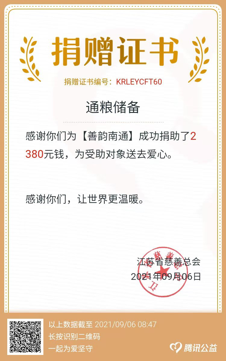 為認(rèn)真落實(shí)《中華人民共和國慈善法》,大力弘揚(yáng)中華民族扶貧濟(jì)困優(yōu)良傳統(tǒng),廣泛號召國有及國有控股企業(yè)干部職工踐行社會主義核心價值觀,關(guān)愛弱勢群體,積極奉獻(xiàn)愛心,按市民政局等單位《2021年“博愛在南通 慈善暖江海”一日捐活動方案》的通知要求,在產(chǎn)控集團(tuán)的統(tǒng)一領(lǐng)導(dǎo)下,通糧儲備組織全體員工于9月4日開展了線上一日捐活動。