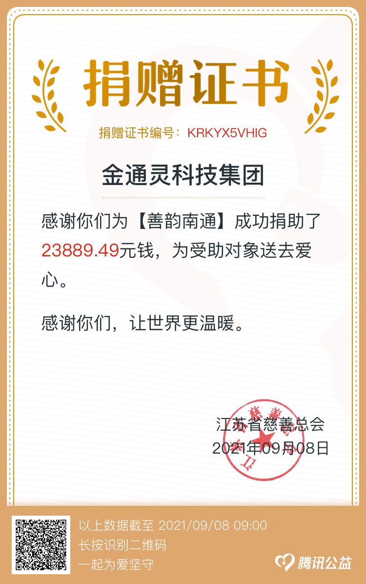 近日,我市組織開展“博愛在南通 慈善暖江?!?span>慈善一日捐活動,金通靈積極響應產控集團的號召,第一時間組織開展一日捐活動。截止到9月8日,金通靈共籌得善款23889.49元,募集資金將統一交至南通市慈善總會,繼續用于扶貧、慈善救助項目。