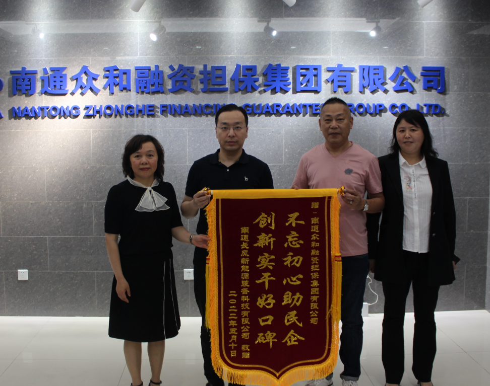 近日,眾和擔保收到一面來自南通長風新能源裝備科技有限公司送來的印有“不忘初心助民企,創新實干好口碑”的答謝錦旗,對我司提供暖心、貼心的擔保“及時雨”表示誠摯感謝。