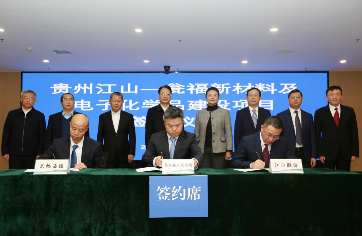 1月27日晚,貴州江山—甕福新材料及電子化學品項目簽約儀式在貴州磷化集團舉行,南通江山農藥化工股份有限公司與甕安縣人民政府、甕福(集團)有限責任公司三方簽訂投資協議,打造磷化工循環一體化產業鏈項目。